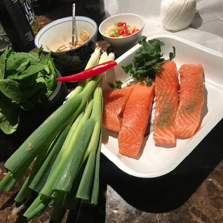 Neem 2 grote stukken boterpapier en leg op elk een grote hand gewassen spinazie in het midden, Leg er de moten zalm op en verdeel er de helft vd de gesneden lente-ui & rode chili over. Rasp er vervolgens de gember over.
